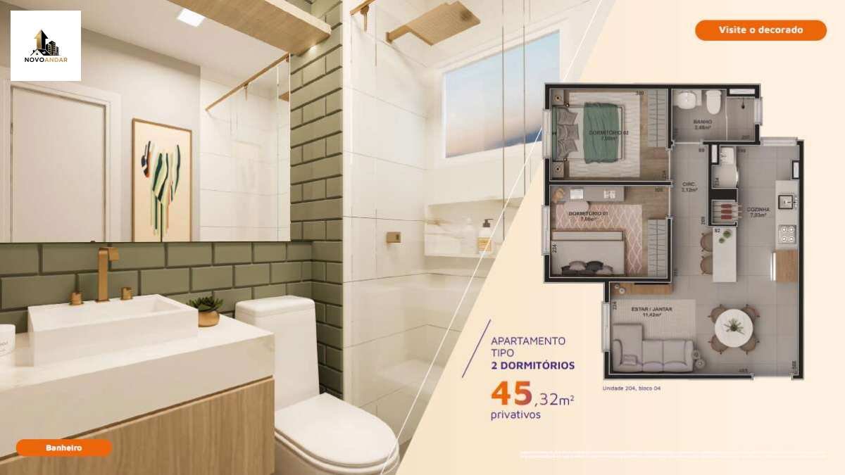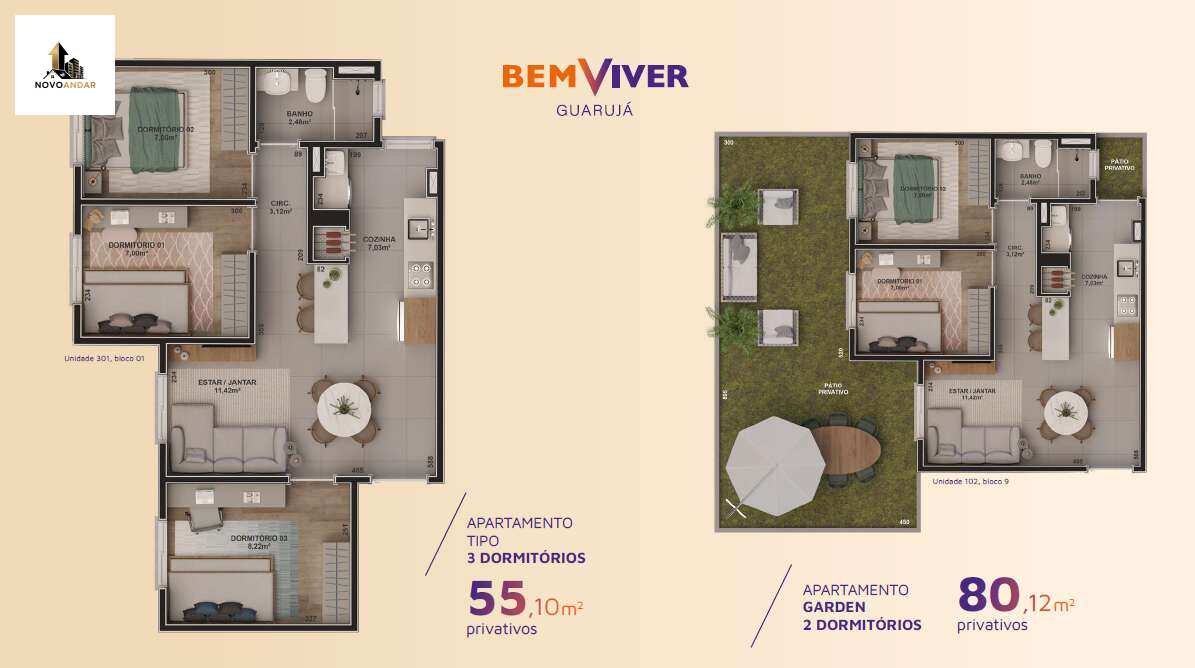 Variações de área privativa: cerca de 45,32 m² até 80,12 m². Existem unidades tipo e do tipo Garden.